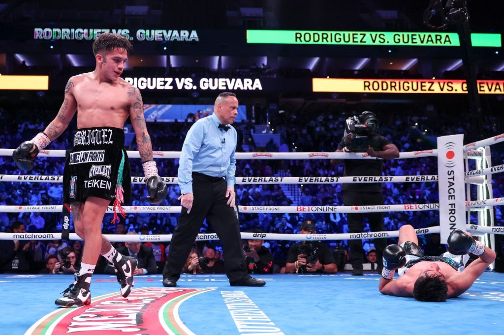第3ラウンド、バム・ロドリゲスはゲバラをロープに背負い、頭部への左打ちで落とした。
